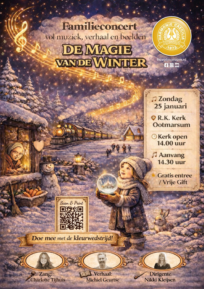 Harmonie St. Caecilia Ootmarsum nodigt op zondag 25 januari jong en oud uit voor een bijzonder familieconcert onder de titel ‘De magie van de winter.’ Tijdens dit concert worden live muziek en een warm winterverhaal op unieke wijze met elkaar verbonden. Het concert is uitermate geschikt voor alle leeftijden en speciaal gericht op gezinnen met kinderen.