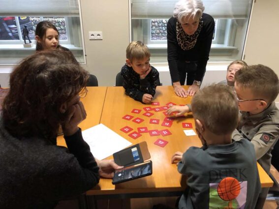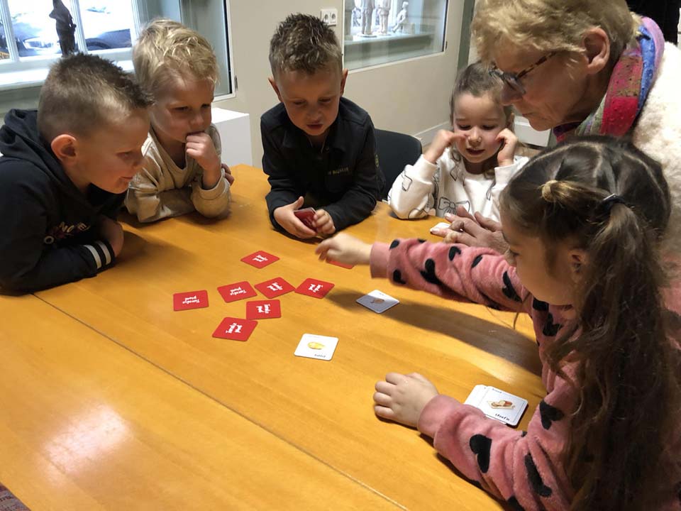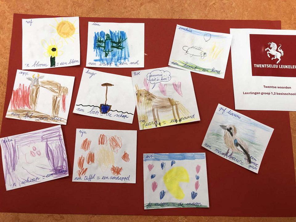 De groep werd in tweeën gesplitst, waarbij de ene groep het Twents memoryspel speelde en de ander groep les kreeg in Twentse woorden van Anne Winkelhuis. Zij is de schrijfster, maar bovenal tekenaar van het boekje ‘Twentse proat….doar woj blie van’. Uit haar tas mochten kinderen voorwerpen grabbelen. Bv. een tuffel, een kips of een siepel. Het bijpassende woord werd erbij gezocht èn de aquarelprent, die ergens was verstopt. Na een half uur werd er gewisseld. Tot slot las Ria Bossink nog een verhaal voor uit ‘Jipke en Jannoaken’. De kinderen kregen een mooie kleurplaat mee en slikkergerei (een spekje). De gemaakte collages kunt u bewonderen in het Heemhuis. Zij zijn op donderdag- en zondagmiddag geopend van 13 tot 16 uur.