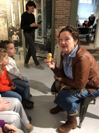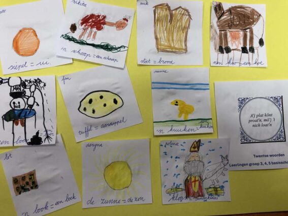 Op maandagmiddag 24 november werd het bezoek op school voorbereid. Er werd gepraat over dialect. Wie kan Twents praten? Wie kan het verstaan? Welke woorden ken je al? Er werd voorgelezen uit ‘Nijntje döt fietsen’, er werd een collage gemaakt van de woorden, die de kinderen al kennen. Tot slot werd ‘Noaber en noaber’ bekeken, de Twentse versie van ‘Buurman en Buurman’.