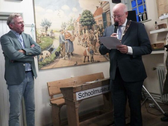 “Excuses, meester Weierink, maar ik ga de rollen omdraaien. Ik neem uw les even over aangezien ik een belangrijke mededeling heb. We zijn vandaag te gast in het Schoolmuseum Ootmarsum voor een les van schoolmeester Weierink. Die les heeft het college van B&W van Dinkelland al een tijdje tegoed. Dat het even duurde voordat we daadwerkelijk naar het Educatorium afreisden, heeft alles te maken met iets belangrijks, maar daarover later meer. Dan zult u het begrijpen.