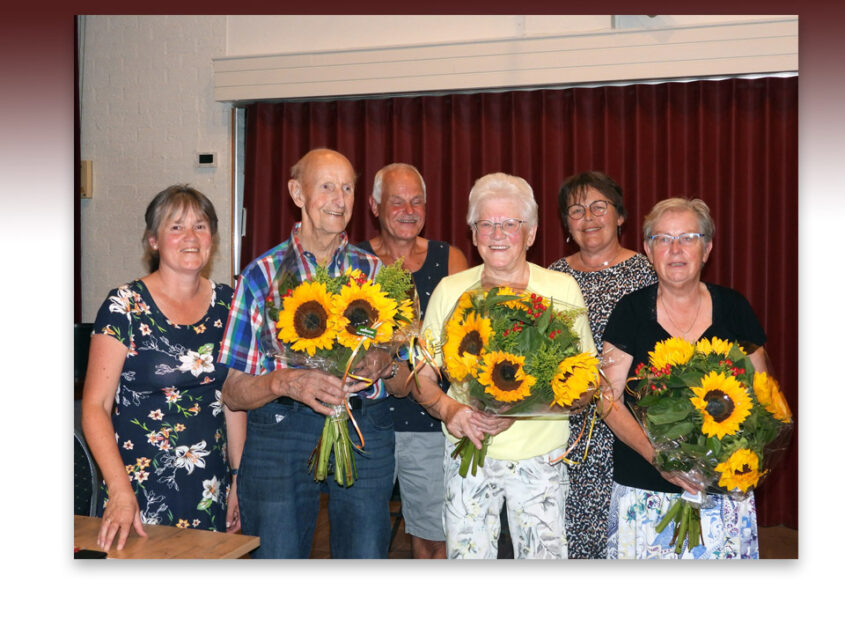 Riky Boers en Johanna Lohuis werden gehuldigd voor hun 55-jarig lidmaatschap. Roelie de Witte en Harm Kruit zijn een halve eeuw lid. Benny Bolk, Carla Nijhuis, Aly van der Aa en Jan Molendijk werden in de bloemetjes gezet, omdat ze 45 jaar het koor zijn trouw gebleven. Trijntje Altena, Ine Schomakers, Karin Baanstra en Henny Molendijk zingen inmiddels 40 jaar bij het zangkoor. Afhankelijk van het aantal ‘zang’jaren kregen de jubilarissen een cadeaubon of een prachtig beeldje in de vorm van een zangnoot.