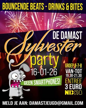 Op vrijdag 16 januari verandert de Damast in Ootmarsum in het gezelligste discofeest van het nieuwe jaar. De Sylvester Party is speciaal voor alle kinderen uit groep 6, 7 en 8 van Ootmarsum en Agelo. De deuren gaan open om 19:30 uur en het feest duurt tot 21:30 uur.