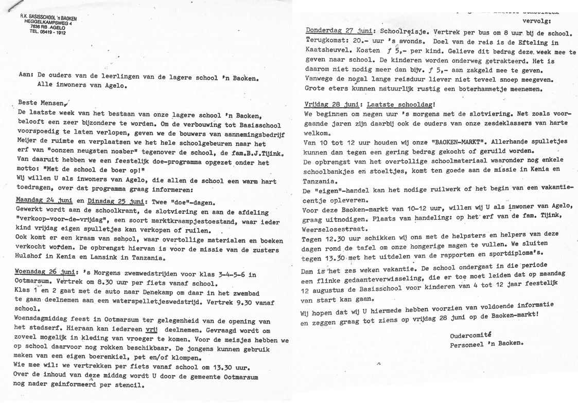 Door dit veranderde systeem moest de school destijds verbouwd worden. Geen nood, want ’n Baoken verhuisde tijdelijk naar de overkant en vond onderdak op de boerderij van de familie Tijink. Letterlijk en figuurlijk met ‘de school de boer op’. Met dit gegeven kwamen er al tijdens de voorbereiding en tijdens de reünie zelf al vele herinneringen naar boven.