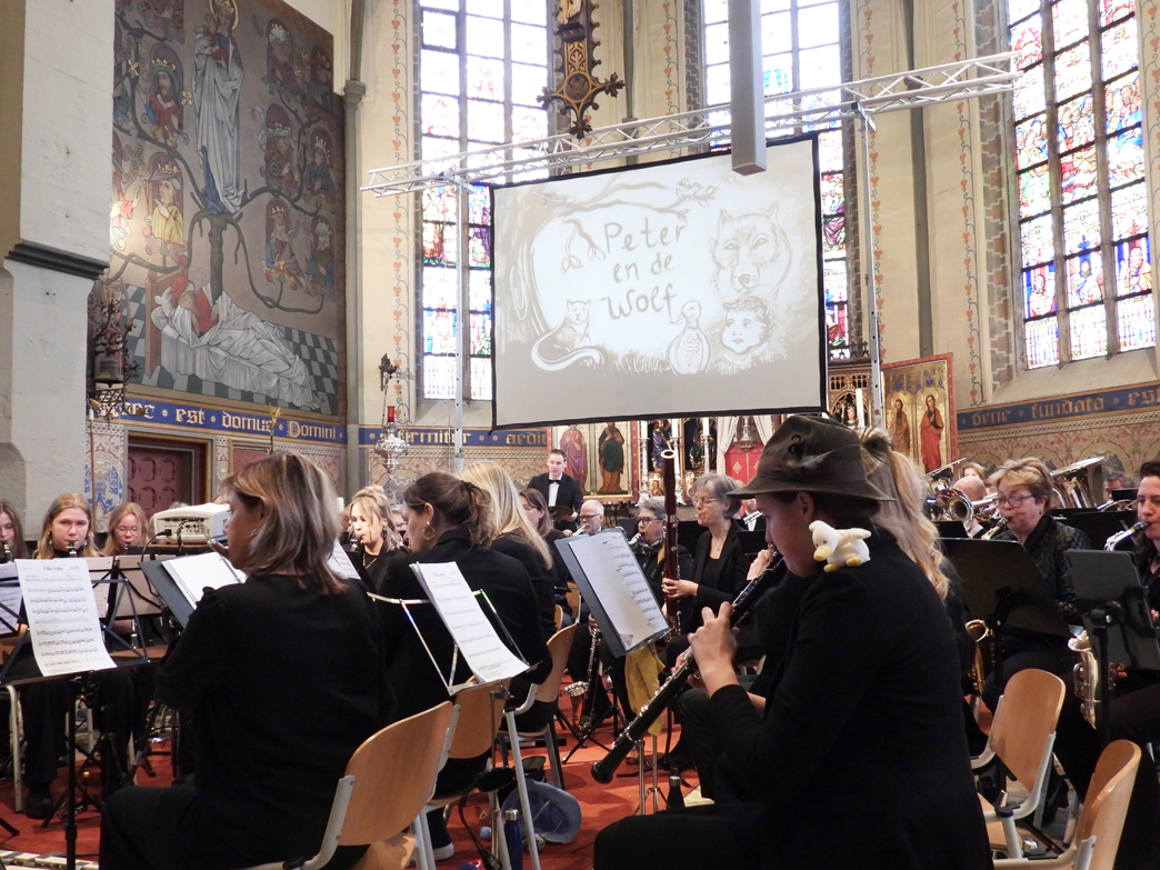De orkestleden met hun dirigente Nikki Kleijsen slaagden daar op een mooie wijze in. De verschillende personages uit dit sprookje werden tot leven gewekt door de instrumenten, die bij Peter, zijn opa, de wolf, de eend, de jagers en nog vele anderen pasten. Dat werd ook mooi uitgelegd door de verteller Theo, die op zijn vertrouwde wijze het sprookje, samen met de muziek, tot leven bracht. Soms best wel eng voor de jonge kinderen, die af en toe met de handen aan de oren hun angsten toonden. Mooi is het om te zien dat ze werden gerustgesteld door hun ouders. En er waren zelfs kinderen, die heerlijk op moeders schoot in slaap waren gevallen. Daar zijn sprookjes ook voor, want op menig kinderbed zullen ze zijn verteld voor het slapen gaan.