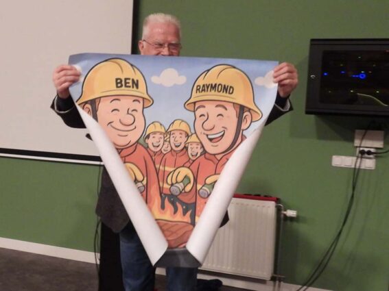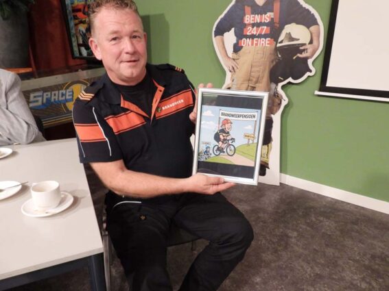 Wethouder Rob Olde Kalter, een fietskameraad van Ben Voorpostel, sprak namens de gemeente lovende en luchtige woorden uit aan het adres van de scheidende brandweerman. Een humorvolle toespraak, die helemaal past bij het karakter van de Höwerboer. De wethouder combineerde het jubileum van Raymond van Benthem, vijftien jaar lid van de brandweer en het afscheid van Ben aan elkaar. Hij noemde Raymond de man van de dubbele spuit, want in zijn werkzame leven werkt hij voor het Ki-station en als vrijwilliger spuit hij natuurlijk om branden te blussen. “Het mooie is dat hij bij het KI aan het begin staat van iets nieuws en bij de brandweer een sluitpost is om branden te blussen. Raymond en Ben hebben trouwens nog wel wat gemeen. Ze zijn ervaren chauffeurs en weten de weg naar iedere boer. Bij de nodige uitrukken is dat zeker een voordeel. Ik zit bij een Ootmarsumse fietsclub met onder meer Ben, maar ook met nog een aantal gepensioneerde brandweerlieden. BBL Tom Busscher fiets in de zomermaanden mee, Leo 4 (Leo Kamphuis) is altijd van de partij en we hebben ‘Toekomst’ Ben. Ik wil graag beginnen met ‘Er was eens’ een brandweerman tussen stal en kazerne. We noemen hem koperbuik en dat is een geuzennaam. Veel waardering voor zijn inzet en doorzettingsvermogen. Tijdens onze fietstochten horen we regelmatig ‘Jongens kan het wat rustiger’ en dan fietst Ben ons allemaal voorbij, neemt de kop en na een aantal kilometers horen we ‘Het gaat weer lekker’. ‘Leo’, zegt Ben, ‘Wat is het zwaar, de wind was vroeger minder streng’. ‘Dat heeft te maken met jouw buik’, laat Leo weten. Tijdens een mooie rit in Limburg hebben we trouwens Ben de kans gegeven om als eerste boven te komen. Het heette de Slakweg en nu is hij dus binnen zijn wielerploeg de kampioen van deze helling.” Vervolgens gaf de wethouder nog maar eens de verbinding aan tussen jubilaris Raymond en Ben Voorpostel. “KI is het begin, Ben wil met zijn veestapel verjongen en wij hebben zin in een barbecue.” De wethouder overhandigde vervolgens een prachtige prent met Raymond en Ben op de voorgrond en met hemzelf wat meer op de achtergrond. “Ik hoop voor deze barbecue te worden uitgenodigd,” lacht de wethouder om er vervolgens aan toe te voegen, “Je bent een brandweerman in hart en nieren. Met veel relativeringsvermogen en humor en je was er wanneer je er moest zijn.”