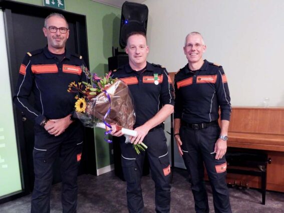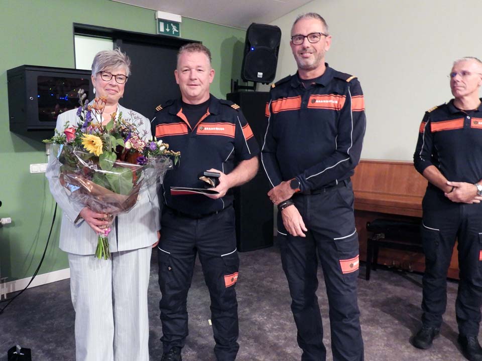 Ook kazernecoördinator Harald Schulten sprak zijn waardering ui voor de scheidende brandweerman. “Ben is in 1991 via Martin Koster bij de brandweer gehaald. De eerste maanden ‘zwart’, want hij is officieel toegetreden op 1-1- 1992 en hij nam afscheid op 1-7-2025. Ie bint d’r een met KOP, een geweldige eigenschap die elke brandweerman of –vrouw zou moeten hebben. Door jou doorzettingsvermogen maak je bijna alles mogelijk. Leuk voorbeeldje is wel je rol als pompbediener tijdens onze deelname aan de brandweerwedstrijden in Steenwijk. Je bonuspunten waren uniek en zeer terecht, want wat jij deed kon eigenlijk niet, maar het lukte je toch. Wie kan er nou een opzetstuk plaatsen en de kraan openen terwijl je eigen TS erop staat! Ook tijdens jouw hobby’s wielrennen en mountainbiken sta je bekend om je doorzettingsvermogen. Daarnaast ook om je gezelligheid. Ben houd hiervan maar draagt hier ook enorm aan bij. Samen met Nick Weierink heeft Ben de opleiding Brandwacht, Brandwacht 1e klas en Hoofdbrandwacht succesvol afgerond op 1-1-1998. Daarna heeft Ben ook de opleiding Brandweerchauffeur en pompbediener behaald. De familie Voorpostel is nog steeds koploper onder alle leden als het gaat om uitrukken. De teller staat gelukkig alweer een tijdje stil bij vier, maar de brand in de keuken van het oude huis staat ons nog steeds goed bij. Als je kijkt naar de huidige invulling van de oude boerderij is het maar goed dat we de brand hebben kunnen blussen, anders was Bed en Breakfast Erve Höwerboer er waarschijnlijk nooit geweest. Gelukkig is dit wel zo en gaat het erg goed met hun bedrijf. Dit is ook zeker dankzij de hulp van de kinderen en hun ouders, maar eigenlijk dus ook deels dankzij de Brandweer. Ben hartelijk bedankt voor de afgelopen 33,5 jaar bij de brandweer. We hopen nog lang van je diensten gebruik te maken als oud lid en hopelijk mogen we nog soms bij jullie oefenen (geen uitruk). Renate, ook jij bedankt voor de vele uren dat je Ben hebt moeten missen en steun die je Ben gaf om de brandweerman te kunnen zijn die hij was.