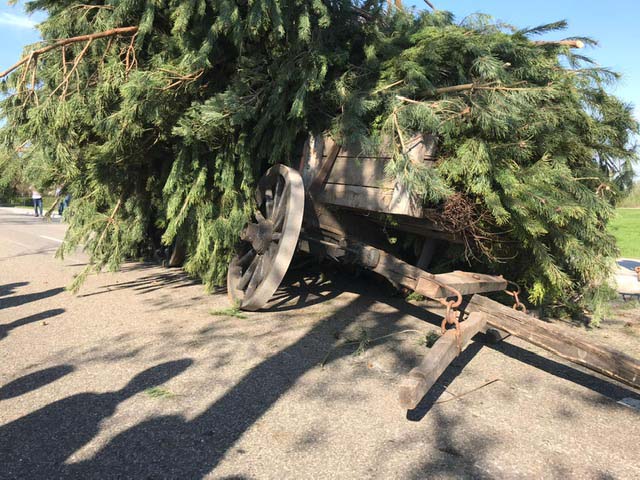 Op de Laagsestraat, pakweg 200 meter voor café restaurant de Postelhoek begaf het rechtervoorwiel het van de derde wagen. De spaken lagen er ineens uit en dat zorgde natuurlijk voor onbalans, waardoor het wiel wegklapte. Dat is dan toch een tegenvaller en een smet op een verder prima verlopen dag. Na een grondige inspectie bleek al snel dat deze wagen de eindstreep niet zou halen. Vervolgens hebben we Postel gebeld en die waren er binnen 5 minuten om het paashout van deze wagen af te halen en in een vrachtwagen met container naar de Poaskaamp te brengen. Met de beide andere wagens zijn we vervolgens doorgereden naar het stadje om daar door het centrum te trekken. De overgebleven paaswagens haalden onder grote belangstelling het einddoel. Heel bijzonder en vermoedelijk uniek, maar we konden niet anders en we denken dat we het op deze wijze prima hebben opgelost,” aldus Wouter oude Vrielink.