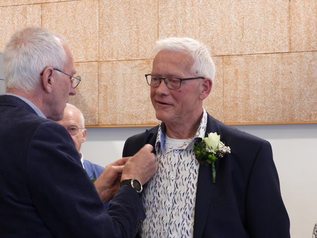 “Het is een gezellige club en ik mag hier graag komen. Jullie verzorgen nu de shows in Het Damast en dat is een voormalig fabriekspand van 209 jaar oud. In 2011 werden jullie één van de gebruikers, nadat het helemaal gerenoveerd is. Als vereniging hebben jullie inmiddels vele shows georganiseerd en het loopt altijd heel gesmeerd. Dit jaar is jullie de EVS, de Euregioshow, weer toegewezen en als district hebben we daar alle vertrouwen in dat het weer goed komt. En hopelijk staan we hier over 10 jaar weer en vieren we opnieuw een feestje als jullie 60 jaar bestaan.” Vervolgens reikte hij de versierselen uit aan Herman Keupink en Henk Tijink. Tonnie Groeneveld zal op een later tijdstip de versierselen krijgen uit handen van voorzitter Harry Harink met één of meerdere leden van de Vogelvereniging Ootmarsum.