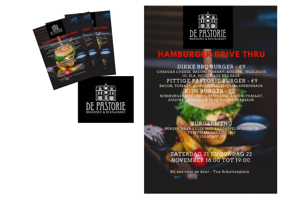 Brasserie en restaurant De Pastorie moet, door de maatregelen om het Coronavirus de kop in te drukken, de deuren gesloten houden. Stil zitten is er niet bij en dus wordt hard gewerkt aan een heuse Hamburger Drive Thru. In het weekend van 21 en 22 november opent het restaurant deze Drive Thru. Haal de lekkerste burger op en ervaar een unieke beleving bij deze Drive Thru. Rijd bij De Pastorie langs op het Ton Schultenplein, blijf lekker in de auto zitten en kijk LIVE mee naar het bereiden van de smaakvolle burgers. Zaterdag en zondag geopend van 16:00 uur tot 19:00 uur.  Uiteraard is er ook aan de kleintjes gedacht met een kidsburger en een kleine verrassing!