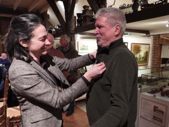 Jules Kokhuis, ook lid van de Midwinterhoornblazers, gaf aan dat veurman Hans enorm veel betekend heeft voor het midwinterhoornblazen in Ootmarsum en omstreken. “Hans, je wilt geen lintje, maar we vinden dat je toch in het zonnetje gezet moet worden. Dat wil je niet, maar we willen onze waardering uitspreken voor je geweldige inzet voor het midwinterhoornblazen in Ootmarsum. Met Gerard Arens, Harry Hemmer en Herman van der Aa gaf jij sturing aan een kleine groep, maar door jouw enthousiasme zijn er jaarlijks cursussen midwinterhoornblazen en houd je waardevolle contacten met de Duitse en Denekampse noabers. Je verzorgt de avondwandelingen en hebt via het Glazen Huis geregeld dat we warme, nieuwe jassen hebben kunnen aanschaffen. Je bent een veurman een aanjager en een echte ambassadeur voor het midwinterhoornblazen in Ootmarsum. Daarom wil ik Rebecca Lentelink vragen om jou deze onderscheiding op te spelden. Ook willen we jouw vrouw Ine in deze hulde betrekken met een bos bloemen, omdat we weten dat zij jou die ruimte geeft. Hans namens ons allemaal van harte gefeliciteerd,” sluit Jules Kokhuis zijn speech af.