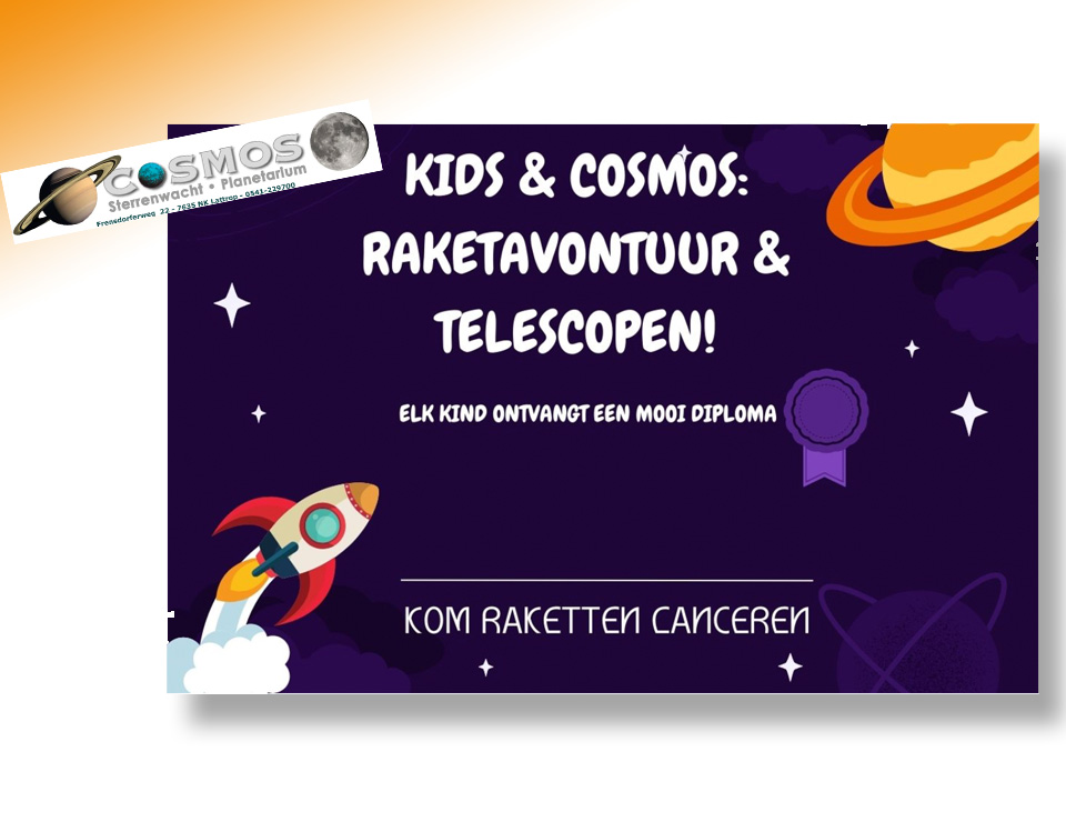 Tijdens de herfstvakantie kunnen jonge ruimtefanaten zich uitleven bij Sterrenwacht Cosmos in Lattrop. Op dinsdag 21, woensdag 22 en donderdag 23 oktober organiseert de sterrenwacht het speciale kinderevenement “Kids & Cosmos – Raketavontuur & Telescopen”. Een middag vol ontdekken, bouwen en lanceren — speciaal voor kinderen van de basisschool.