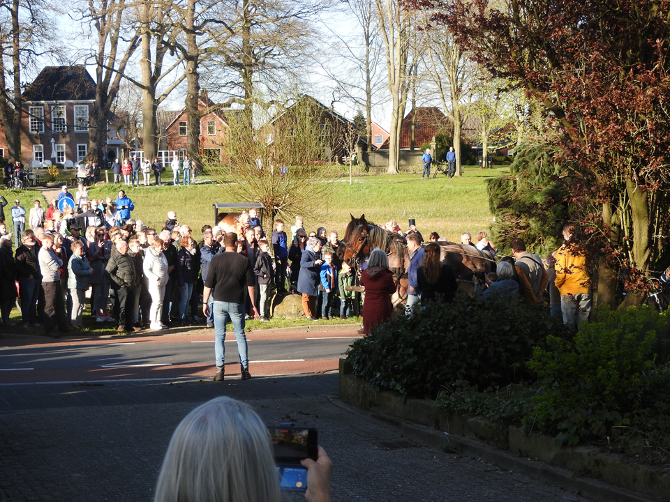 Honderden mensen volgden de Poaskearls naar het Springendal om daar het hout op te tasten op de drie paaswagens. Ze zullen niet allemaal geholpen hebben, maar velen hebben een zeer gezellige middag gehad op de terrassen van de horecagelegenheden de Postelhoek en de Mors. Het blijft toch een soort reünie waar vriendengroepen elkaar treffen, maar ook families, toeristen en Siepels in volledige harmonie volop genieten van deze Paastraditie. Alles verliep prima. Geen pech onderweg en met de ervaren voerlui vonden de paarden hun weg naar de paasweide. Ook een compliment aan de verkeersbegeleiders en de mannen, die zorgden dat ook het laatste stukje naar de paasweide veilig kon plaatsvinden. Daar stonden trouwens ongelooflijk veel mensen te kijken hoe de volgeladen boerenkarren de Poaskaamp bereikten. Vele handen zorgden er voor dat het hout binnen de kortste keren op ’n baoken werd gelegd. Prachtig om dit mee te maken, want de saamhorigheid is groot en Ootmarsum kan zich na deze Paaszaterdag weer opmaken voor de beide Paasdagen, die bol staan van de tradities. De rondgang om de Wheme, het vlöggelen en natuurlijk het ontsteken van het Paasvuur op de eerste Paasdag. Na twee jaar zijn de tradities terug en hoe mooi is het dat de nieuwe Poaskearls hun geheim twee jaar lang hebben bewaard. Dries Arens en Wout Velthuis genoten zichtbaar, maar dat gold ook zeker voor de andere zes Poaskearls. Het paashout ligt op de paasweide en hoe!!!! 2022 is nu al een jaar om deze Paaszaterdag nooit meer te vergeten.
