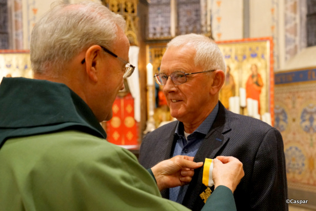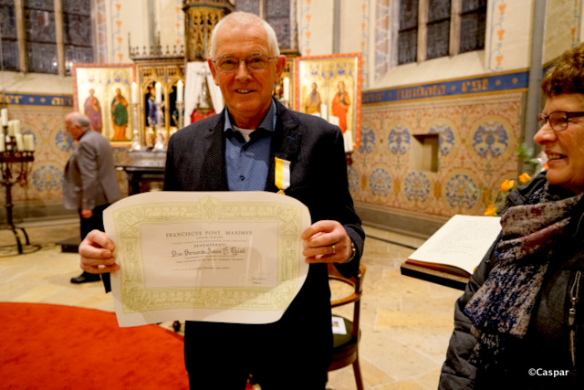 Uit handen van pastor Jan Kerkhof Jonkman ontving Bennie Tijink een hoge pauselijke onderscheiding. Deze gouden kracht voor de R.-K. kerk in Ootmarsum is maar liefst 50 jaar lid van de collectanten van deze parochie. De bedoeling was om de onderscheiding op 13 januari uit te reiken, maar door onvoorzien omstandigheden is dat niet gelukt. In de viering van 16 februari vond dit ceremonieel plaats en niet alleen voor Bennie Tijink en zijn vrouw Annie, maar ook voor Kerkhof Jonkman was het een heel bijzonder moment, want de pastor had nog nooit een dergelijke hoge onderscheiding mogen uitreiken.