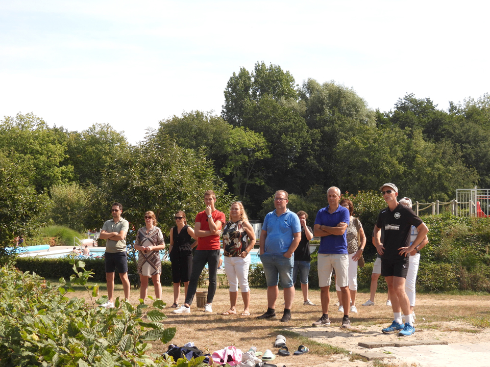 Joke van Zuilekom, van de ‘buren’, de Jeu de Boulesvereniging, feliciteerde Set-Up ’65 met de prachtige voorziening. “Het is fijn dat onze sport, het beachvolleybal en het zwemmen zo mooi naast elkaar passen.” Zwembad de Kuiperberg krijgt op deze wijze steeds meer een multifunctioneel karakter. Daarna nam Matthijs Bult, voorzitter van Set-Up ’65, het woord. Hij benadrukte dat het zonder de vasthoudendheid van Gerard Leussink niet was gelukt. “Het is mooi dat ook de andere bezoekers van het zwembad gebruik kunnen maken van de beachvolleybalvelden”, vertelde Matthijs. “Ook voor onze volleybalvereniging is het een aanwinst, waardoor er meer mogelijkheden zijn gecreëerd. Naast het volleybal in de zaal, kan er nu ook ‘op het strand’ worden gevolleybald.”