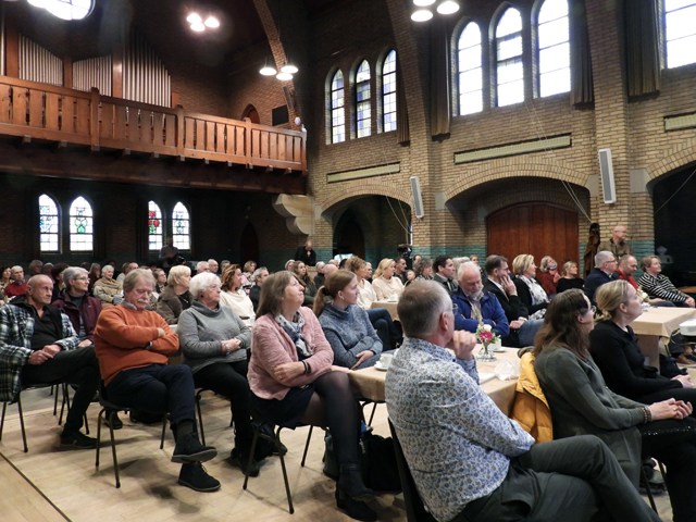 De ‘gepensioneerde’ journalist Alphons Weierink opende deze bijeenkomst in een nagenoeg volle kloosterkapel.