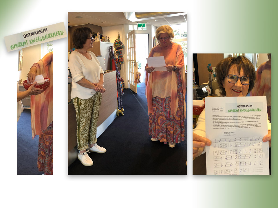 De goede oplossing was: ‘In Kunststad Ootmarsum Krijgen De Kwetsbare Kunstenaars Een Podium.’ De mooie prijs van een Art Brut kunstwerk t.w.v. € 300,00 gaat naar Coevorden. Winnares Heleen Oudhuis was zeer blij verrast en komt binnenkort graag weer naar Ootmarsum om een Art Brut kunstwerk uit te zoeken in ART BRUT KIK Galerie.