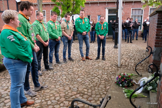 Na de bijeenkomst in de r.-k. kerk stonden leden van Scouting Ootmarsum klaar met een bloem voor alle deelnemers aan de stille tocht en onder tromgeroffel van de drumband van harmonie Caecilia legden de aanwezigen bloemen bij het Joods Monument aan de Kloosterstraat om vervolgens door te lopen naar het herdenkingsmonument op het Bergplein. Paul Schulten speelde daar als vanouds The Last Post en blies exact een paar seconden voor 20.00 uur zijn laatste toon. Daarna volgde een indrukwekkende stilte op deze locatie waar iedereen met zijn eigen gedachten invulling aan kon geven. Harmonie Caecilia zette na deze twee minuten het Wilhelmus in dat massaal werd meegezongen op het Bergplein. Een prachtig moment van solidariteit. Met een aantal koralen vervolgde de harmonie onder leiding van Tim Baars deze plechtigheid, waarna er gelegenheid was om kransen en bloemen te leggen bij het monument op dit plein met een onuitwisbare herinnering aan de Tweede Wereldoorlog, die ook in Ootmarsum zijn slachtoffers heeft gekend. Met deze 4 mei viering worden ze ook 74 jaar na dato nog altijd geëerd.