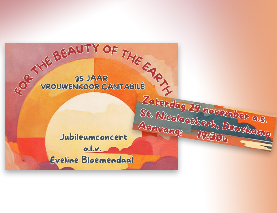 Het Vrouwenkoor Cantabilé bestaat 35 jaar. Om dit zevende lustrum extra kleur te geven wordt er een bijzonder jubileumconcert gegeven. Het koor, dat bestaat uit 30 leden, brengt een ode aan Moeder Aarde. Het thema is dan ook: ‘For the beauty of the earth’. Van de zintuigen wordt niet alleen het gehoor aangesproken. Muziek en zang worden visueel ondersteund met beelden, die voor velen herkenning oproepen. ‘For the beauty of the earth’ hoef je immers niet ver van huis te zijn.