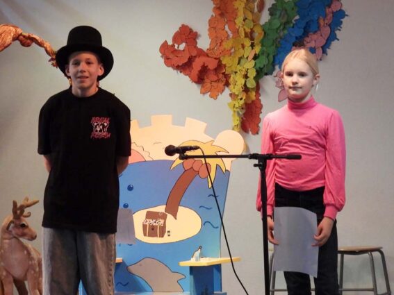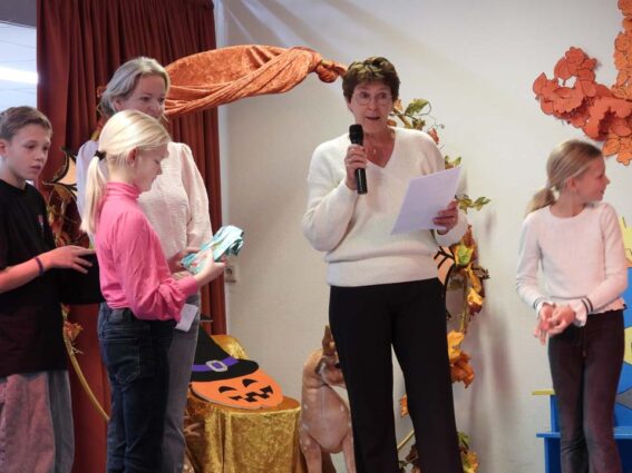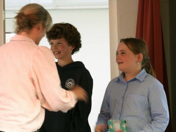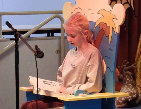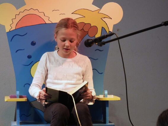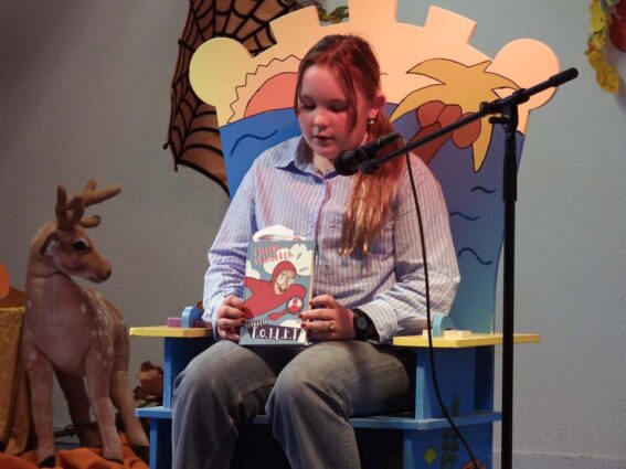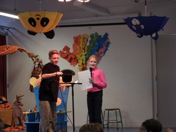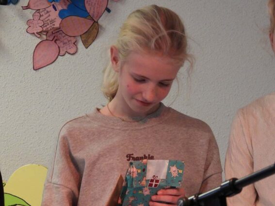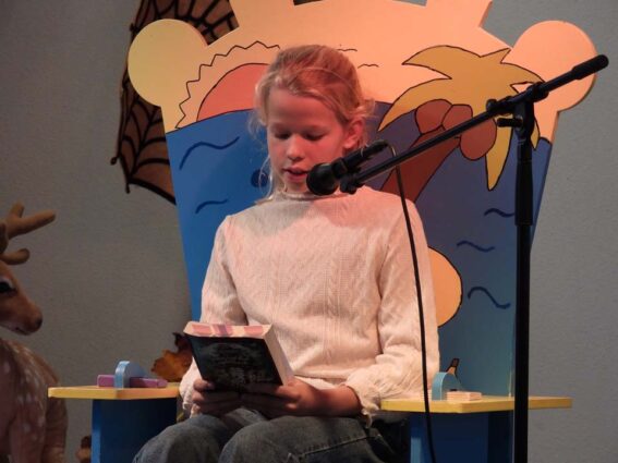 Vervolgens kwam Fiep Heerdink uit de hoge hoed. Deze achtste klasser deed het heel goed en zorgde ook voor veel contact met het publiek. Daarnaast had ze een mooie intro en las ze voor uit de ‘Magische apotheek’. Een verhaal dat de leerlingen aansprak.
