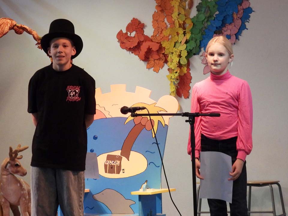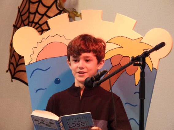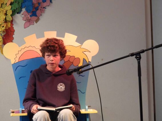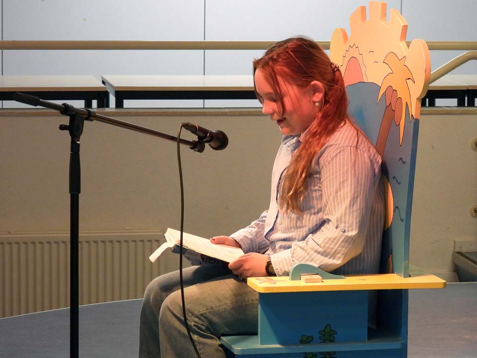 Julius Alting was de nummer vijf in de rij en vol bravoure las hij voor. Heel bijzonder was ook dat hij de nodige passages uit zijn hoofd kende en dus mede daardoor een heel mooi contact kreeg met het jonge publiek.