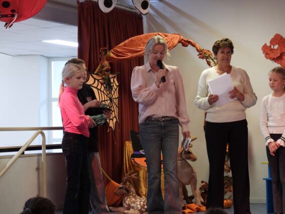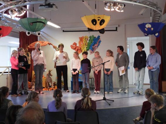 Na deze laatste voorlezer trok de jury zich terug om uit deze zes kandidaten ‘de beste’ te kiezen. Dat werd een moeilijke keuze. Ondertussen werd er gedanst op het podium en ervaarden we ook op welke wijze de Meander bezig is om de Kinderboekenweek vorm te geven. Het lezen staat centraal en dat wordt geïntroduceerd met een mooi toneelspel gebaseerd op het thema. Leerlingen van de bovenbouw lezen zelf voor bij de kinderen van de andere groepen en zo zijn er nog meer activiteiten georganiseerd om het lezen onder de aandacht te brengen.