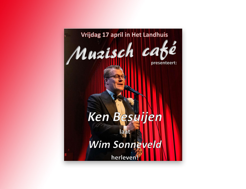 Na het grote succes van het optreden van Ken Besuijen tijdens het Muzisch Café van 20 maart jongstleden komt er met hem een avondvullend programma over Wim Sonneveld. Het levensverhaal van Wim, zijn humor en zijn liedjes, alles komt voorbij wanneer Ken Wim speelt, ja… bijna Wim is. Kortom: kleinkunst, nostalgie en theater.