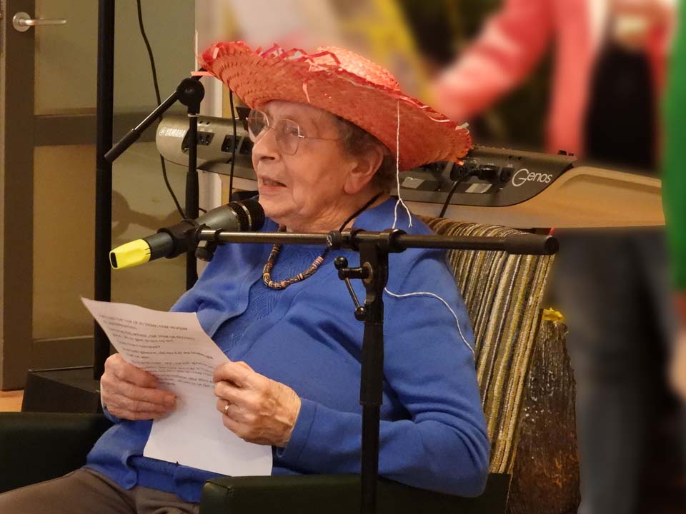 Na deze prachtige bijdrage werden Hepi en Hepi binnengereden om hun ‘Lig op mijn kussen’ te laten horen. Wijkzorg DT liet het ‘Oma’s aan de top te horen’ en daarna werd het heel stil voor stadsdichter Henny Olde Meule, die twee van zijn gedichten voordroeg. Het en handelde over het beeld van de Commandeur en het andere was een warm eerbetoon aan de onlangs overleden ‘bakker en mensenmens Jan Schulten.