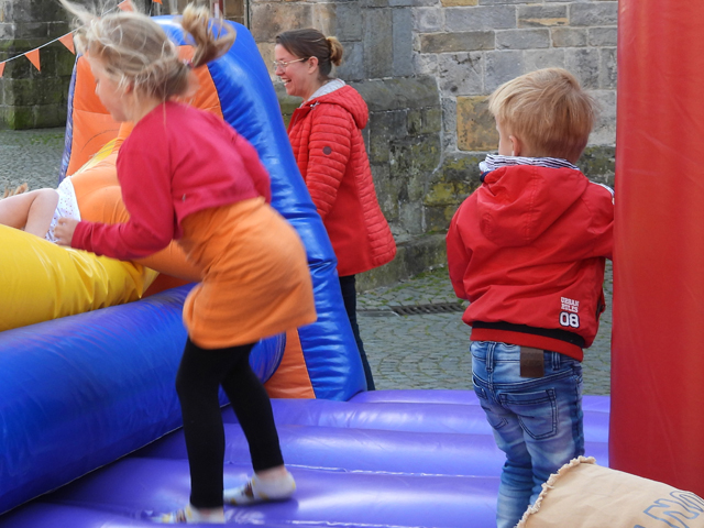 Ondertussen werden op het Kerkplein de nodige voorbereidingen getroffen om de spelen voor de kinderen klaar te zetten. Wat werd het een prachtige actieve middag met veel kinderen en hun papa’s en mama’s, maar ook opa’s en oma’s. Fanatiek werden de spellen gespeeld en wat konden ze zich fijn uitleven op de springkussens en de stormbaan.