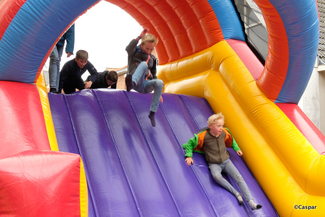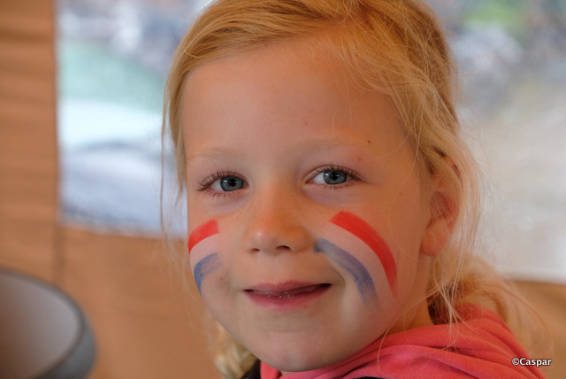 Ondertussen was de organisatie van de Koningsdag druk bezig om een extra tent te plaatsen, zodat er voldoende droge plekken gecreëerd werden. De stormbanen en het voetbalspel kon logischerwijze niet worden overdekt, maar als het droog was maakten veel kinderen gebruik van deze attractieve attracties. Het was dan ook een gezellige boel op het Kerkplein. In een ongedwongen sfeer genoten jong en oud van de vele activiteiten, het heerlijke broodje knakworst en de ranja, die eigenlijk altijd smaakt. En op het moment dat de kinderen uit de schminktent kwamen, waar de vrijwilligers met veel geduld de mooiste creaties op de gezichten toverden. En dan zag je die lachende, geschminkte gezichten en wist je dat deze kinderen en dus ook hun ouders, opa’s of oma’s en andere belangstellenden genoten van deze Koningsdag. Met dank aan de organisatie en de vrijwilligers!!!!