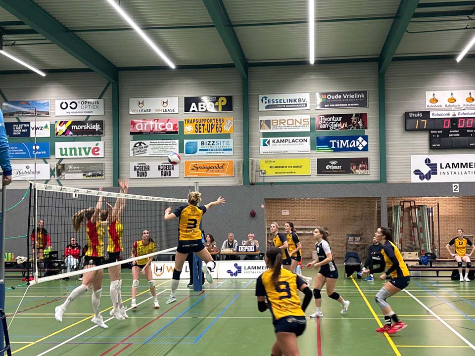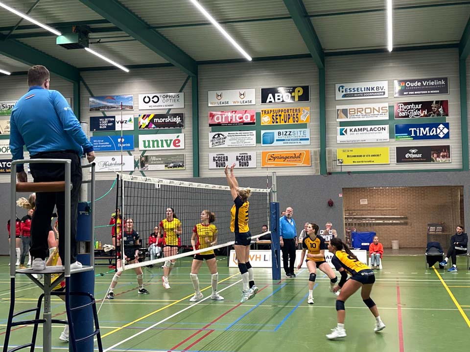 Lammerink Set-Up ’65 begon goed aan de wedstrijd. De Ootmarsumse meiden hadden niet direct een grote voorsprong, maar wisten wel steeds aan de goede kant te blijven en beslisten met een paar knappe punten deze eerste set met 25-21. In de tweede set liep men achter de feiten aan. Dynamo wist bijna alles via de buitenkant te scoren, terwijl bij de thuisploeg juist daar het ritme stokte. Toch wist Set-Up ’65 de spanning terug te brengen, dankzij een aantal goede serveseries. Nipt werd deze set met 22-25 verloren. Ook in de derde set keek de thuisploeg al snel tegen een behoorlijke achterstand aan. Opnieuw kwam Set-Up ’65 terug, maar het bleef te wisselvallig en te rommelig om nog kansen op setwinst te maken. Dynamo pakte de set met 20-25. In de vierde set knokte Set-Up ’65 zich terug in de wedstrijd. Het was zeker niet oogstrelend, maar de klasse van een Merle Baasdam, het goede liberowerk van Fredje Zwiers zorgden er voor dat de rest van het team zich naar een beter niveau trok. Met 25-20 stond het weer gelijk in de Schalm waar de gemoederen verhit werden. Daarvan profiteerde Dynamo het meest in de vijfde set. Zij pakten al snel een 7-1 voorsprong en dat had de thuisploeg vooral aan zichzelf te danken. Slechte passes, een passieve of slechte serve, tactische ballen vol in het blok, matige spelverdeling zorgden steeds weer voor onnodige punten voor de tegenstander, die er vrolijk van profiteerde. Met 15-8 werd deze vijfde set binnengehaald door Dynamo dat daarmee een verdiende overwinning behaalde op basis van meer enthousiasme en ook door slimmer te spelen. Zij wisten met hun spel de juiste aanvalsters op een goede wijze aan te spelen en dat ontbrak in veel fases bij de thuisploeg. Dat verklaart veel over deze verliespartij van Set-Up ’65. Onnodig, omdat de thuisploeg te wisselvallig voor de dag kwam.