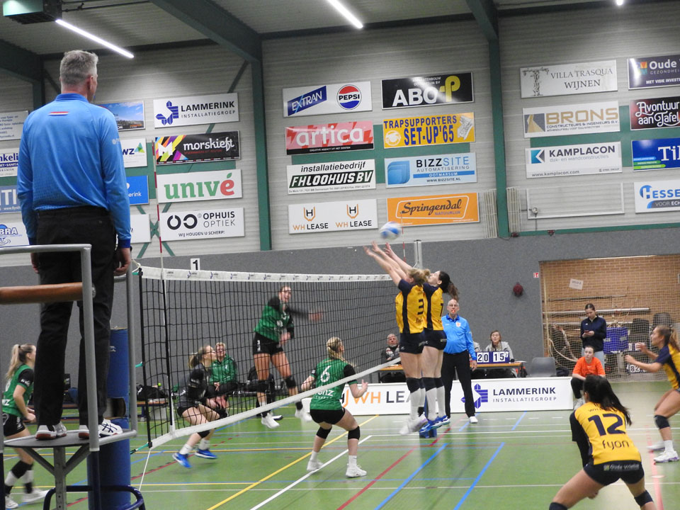 In de eerste set ontliepen de beide teams elkaar nauwelijks. Het was constant stuivertje wisselen. Het publiek was de grote winnaar, want het kon echt alle kanten op. Het zijn dan juist de details, die beslissend zijn en de thuisploeg wist op de juiste momenten en met de juiste keuzes van spelverdeler Noor Vos te scoren. Ook vorige week tegen Dynamo wist dames 1 steeds op beslissende momenten te scoren en vooral geen fouten te maken. Dat leidde tot een knappe winst in deze derby. Set-Up ’65 trok deze lijn door tegen één van de op papier betere teams in deze Topdivisie. Dat zorgde voor een mooie pot met Set-Up ’65 twee sets als bovenliggende partij. Met name serverend en blokkerend liep het gewoon goed aan de kant van de Ootmarsumse meiden. Mooi om te zien dat er gestreden wordt om ieder punt en dat met name de side out in deze eerste sets steeds weer een prooi vormde voor Set-Up ’65. De drive om te winnen, maar ook het vlotte spel, zorgde voor de 25-23 setoverwinning.