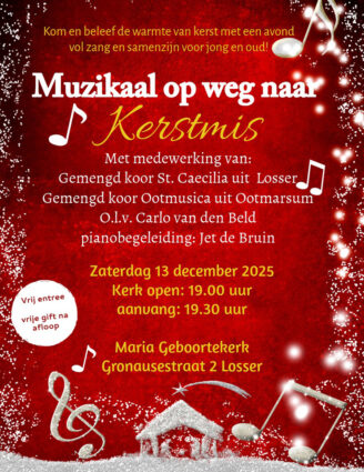 Op zaterdag 13 december wordt dit concert gehouden in de Mariageboortekerk in Losser. De deuren gaan om 19.00 uur open en ‘Muzikaal op weg naar Kerstmis’ begint om 19.30 uur.