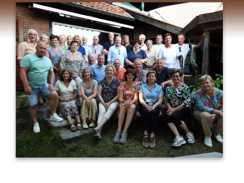 In de tuin van Gert-Jan Buyvoets ontmoetten de leerlingen elkaar weer. Ze werden ontvangen met een heerlijke lunch en de gesprekken kwamen onmiddellijk weer op gang. Het is best opvallend dat veel oud klasgenoten in de omgeving van Ootmarsum zijn blijven wonen. Hoewel de leerlingen vele droeve en vreugdevolle gesprekken deelden, werd met dankbaarheid opgemerkt dat alle oud-klasgenoten nog in leven zijn. Dat mag misschien wel een unicum worden genoemd.