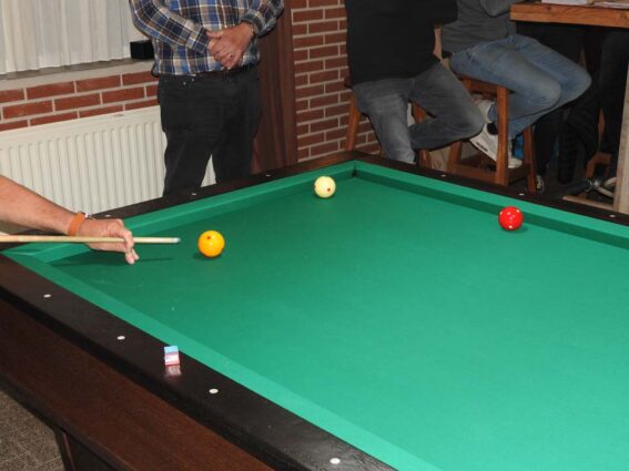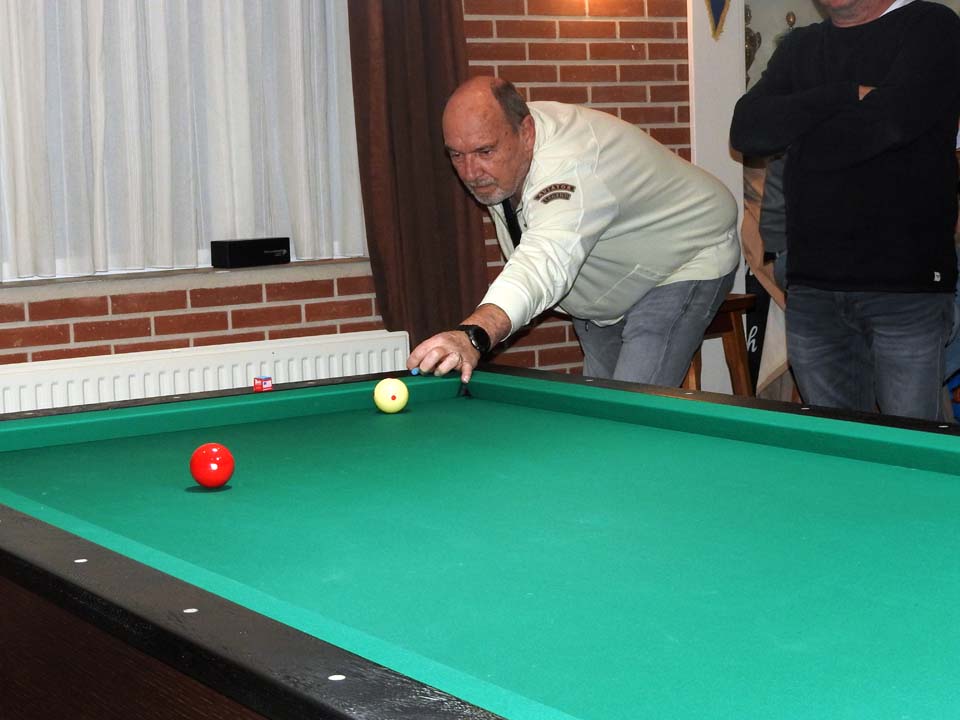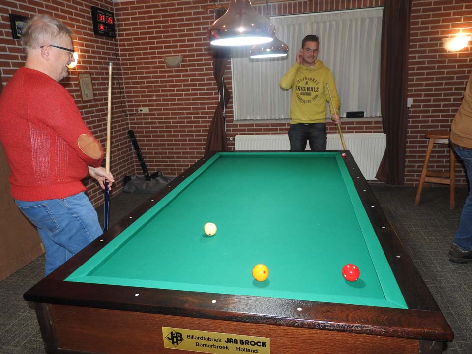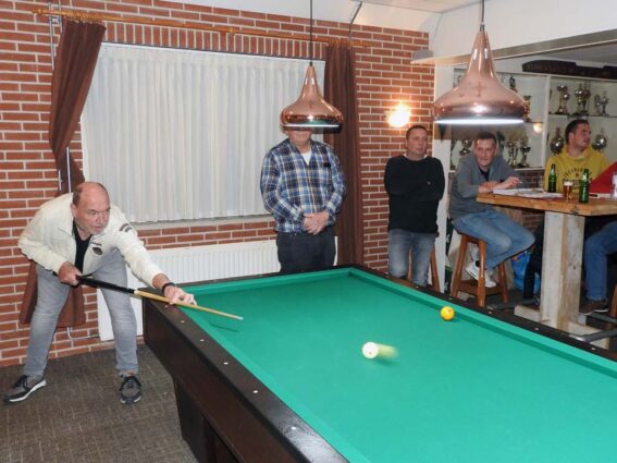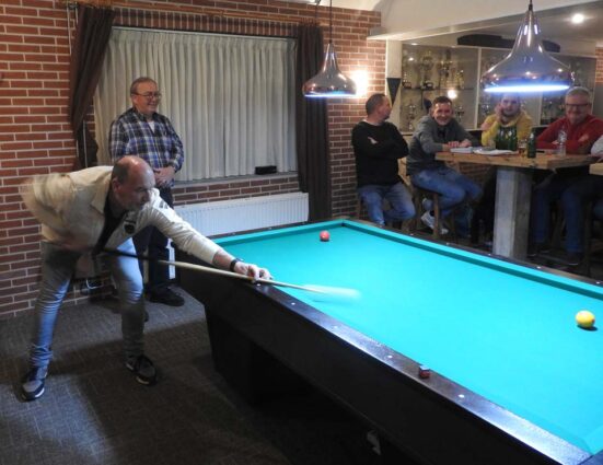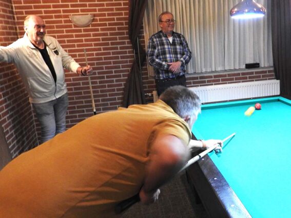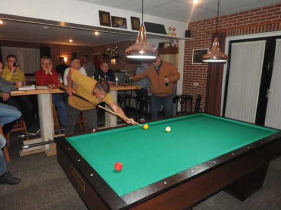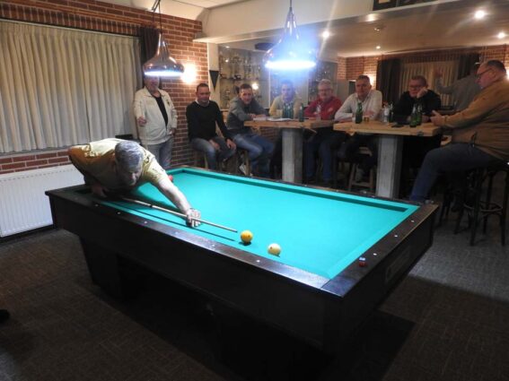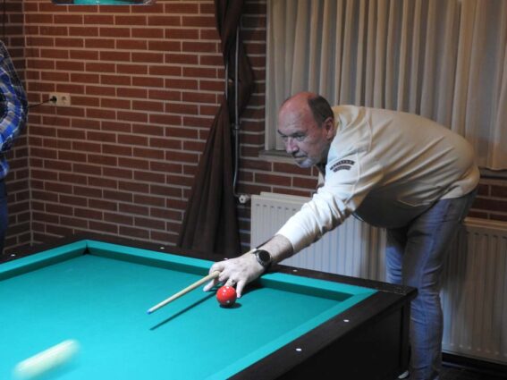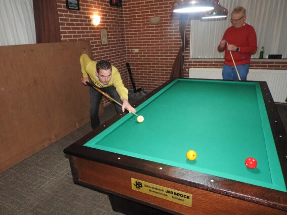 De leden van Ups en Downs schaften zich bij Brock Biljartfabriek in Bornerbroek een biljart aan. Ook dat ging heel soepel en met de tafel werd al binnen de kortste keren geplaatst met de bekende lampen. Verder kwam er een extra kast om de keus en ander materiaal onder te brengen. Het scorebord kreeg een mooie plek en verder stonden er hoge bartafels, zoals die ook bij café de Mors stond. “Wat dat betreft voelt het echt als een soort van thuiskomen. Aan die hoge tafel is er een mooi ‘uitzicht’ op het groene laken. Van daaruit hoor je de complimenten, het gemompel als de stoot wat minder is, maar zeker ook proef je daar de gezelligheid. Op deze vijfde december, Sinterklaasavond, is het voor ons een mooie surprise dat we in dit clubhuis van Oud Ootmarsum ons nieuwe onderkomen hebben gevonden. Een mooi staaltje van echt Noaberschap en waar nodig ondersteunen we ook de klootschietersvereniging, “ laat Gert Jan Mulstege weten. Ondertussen wordt er gebiljart en wie niet speelt wacht rustig op zijn beurt. In deze ontspannen sfeer vindt iedereen zijn plek en voelt zich ook in het clubhuis van Oud Ootmarsum echt thuis.