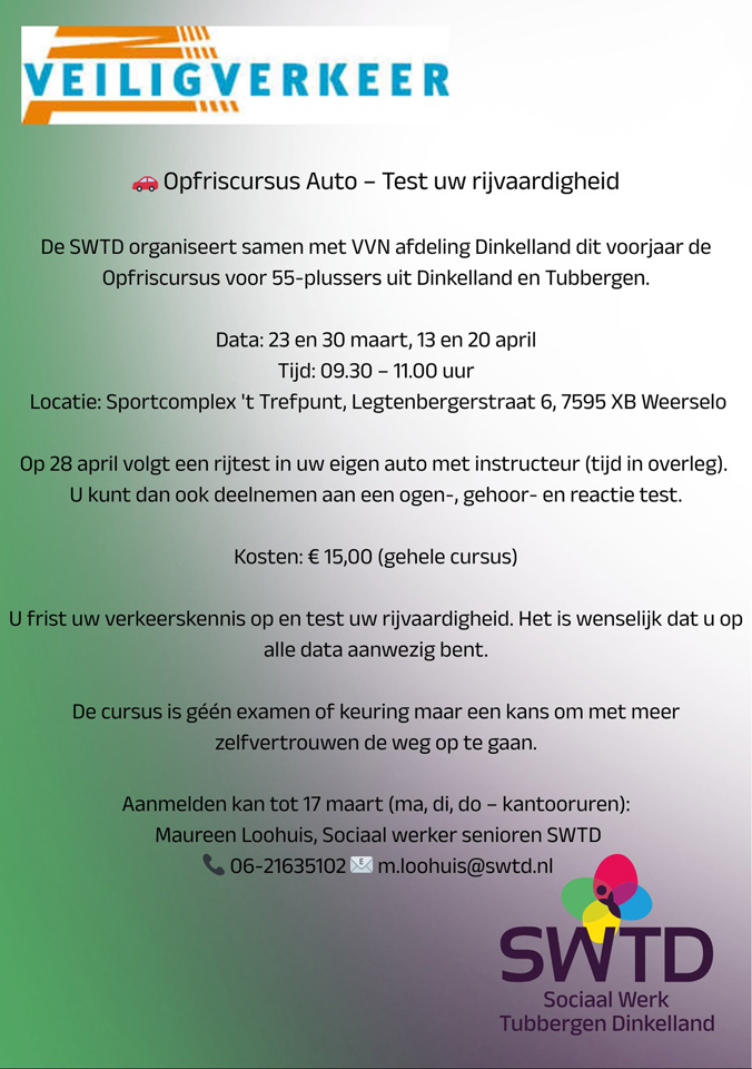 De Stichting Welzijn Tubbergen Dinkelland houdt samen met de VVN afdeling Dinkelland een Opfriscursus voor 55-plussers uit Dinkelland en Tubbergen. Deze cursus is absoluut geen examen of keuring, maar een kans om met het ouder worden toch met zelfvertrouwen de weg op te gaan. De verkeerskennis wordt opgefrist en uw rijvaardigheid getest. Op onderstaande flyer is verdere informatie te vinden. Aanmelden kan tot 17 maart bij Maureen Loohuis. Zij is op maandag, dinsdag en donderdag tijdens kantooruren aanwezig. Bellen kan met 06-21635102 of mailen m.loohuis@swtd.nl.