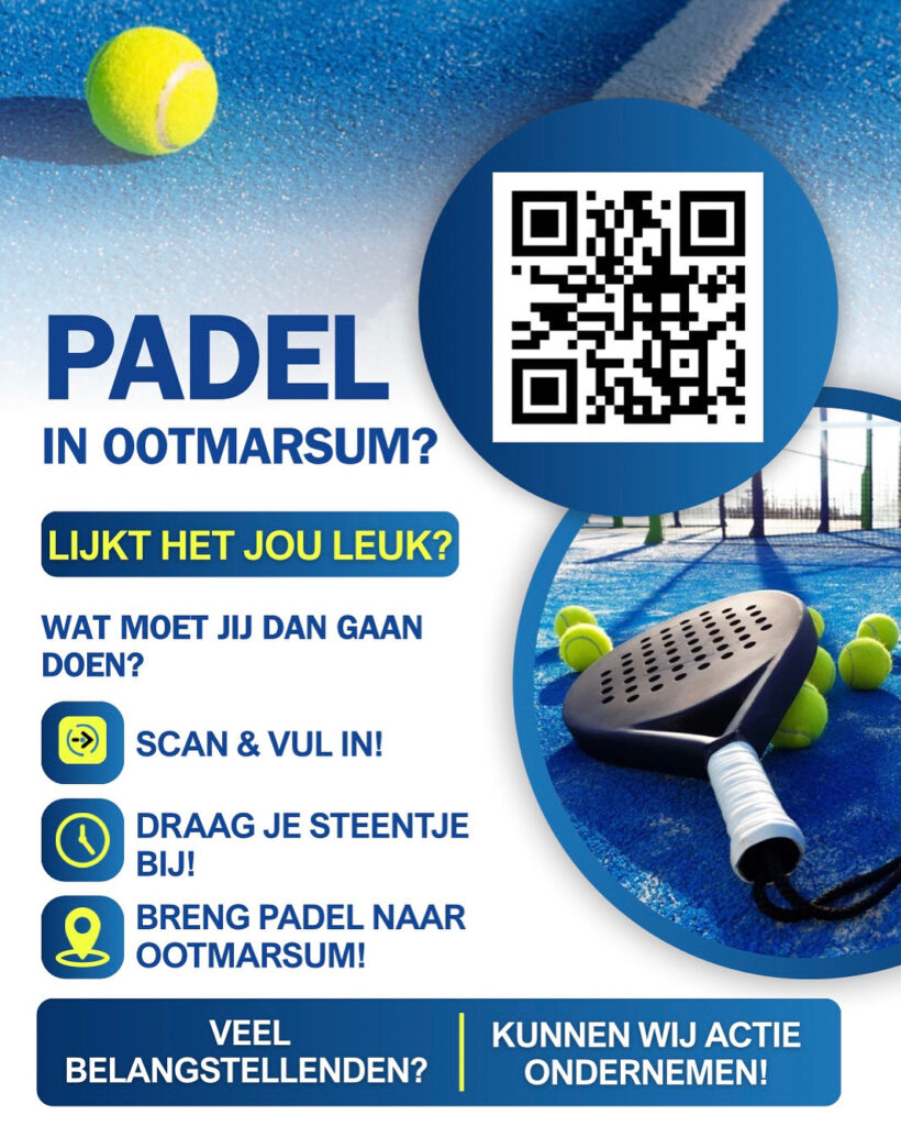 Padel is een sport, die snel in populariteit toeneemt. Het is een unieke racketsport en heeft veel weg van tennis en squash. Een aantal Ootmarsummers beoefent inmiddels ook deze sport, maar om padel te kunnen spelen moeten ze naar omliggende plaatsen. Zij willen graag inventariseren of er meer belangstelling is om te kijken of een padelbaan in Ootmarsum of in de gemeente Dinkelland tot de mogelijkheden behoort. Daarvoor hebben ze een flyer gemaakt, waarop geïnteresseerden aan kunnen geven of er behoefte is om in Ootmarsum padel te kunnen spelen. De flyer is toegevoegd aan dit artikel. Scan de code en vul deze verder in. Bij voldoende interesse zal padel Ootmarsum proberen om in overleg met onder meer de gemeente een padelbaan in de Siepelstad te krijgen.
