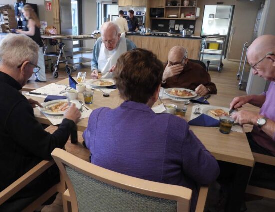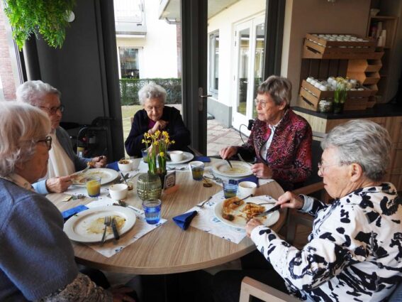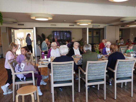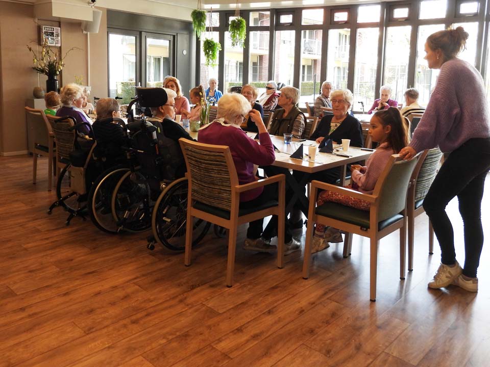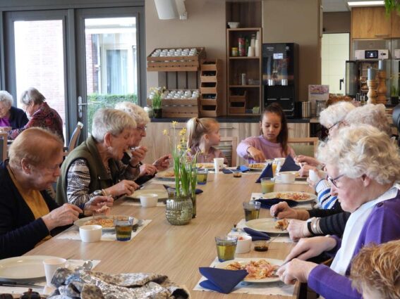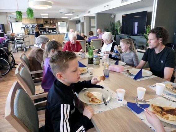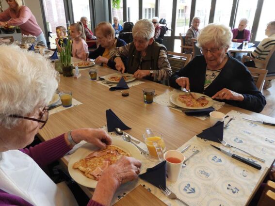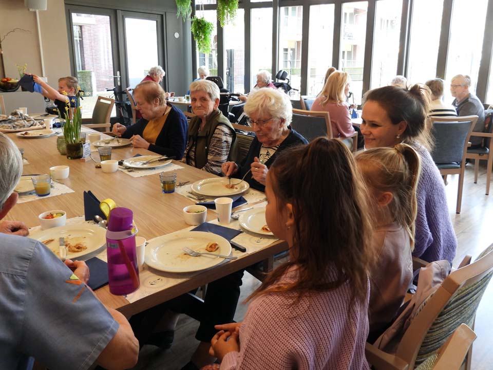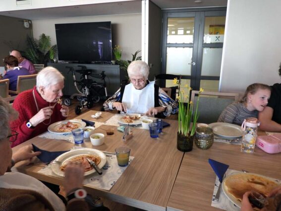 Hoe mooi is het dat de bewoners van woonzorgcentrum Franciscus klaar zitten en wachten op een groep kinderen van de Meander. En wat kwamen die vrolijk binnen op deze Pannenkoekdag. Pannenkoeken werden het hoofdgerecht en gelardeerd met een stuk gezelligheid. Het eten van een pannenkoek verbindt en dat bleek ook nu weer. Senioren en jongeren samen aan tafel om samen te genieten van deze lekkernij. De stroop op tafel, de spek in de pannenkoek en wat zorgt dat voor een heerlijke smulpartij bij jong en oud. Na de pannenkoeken volgde er een heerlijk toetje en dat maakte deze gezamenlijke maaltijd helemaal af. Opnieuw een geslaagde combinatie tussen senioren, de basisschoolklas van de Meander en de pannenkoeken.