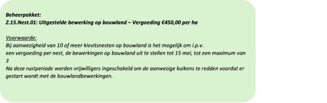 Bij een nest op bouwland wordt het nest zorgvuldig verplaatst of er wordt door boer/loonwerker ruim om het nest heen gewerkt. Wanneer een kievitsnest op bouwland verplaatst wordt (max 5 meter) dient ook het nestmateriaal overgezet te worden. Wanneer er 10 of meer nesten op een bouwland liggen kan de gebruiker in plaats van uitbetaling per nest ook kiezen voor uitgestelde bewerking op het betreffende perceel tot 15 mei (zie beheerpakket Z.15.Nest.01).