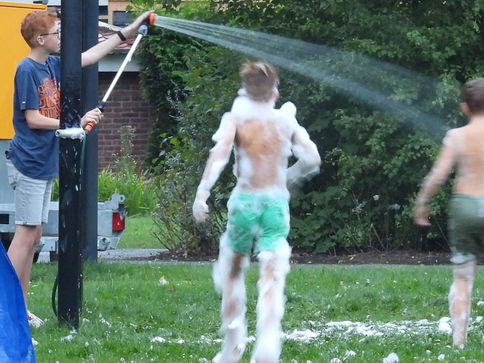 Wat een feest in het park tegenover de Meander. Daar stond een heus schuimkanon om ‘natte watten’ op de Damastjeugd ‘af te schieten’. De ruim honderd kinderen hadden plezier voor tien en wat zagen ze er soms donzig en schuimend uit.