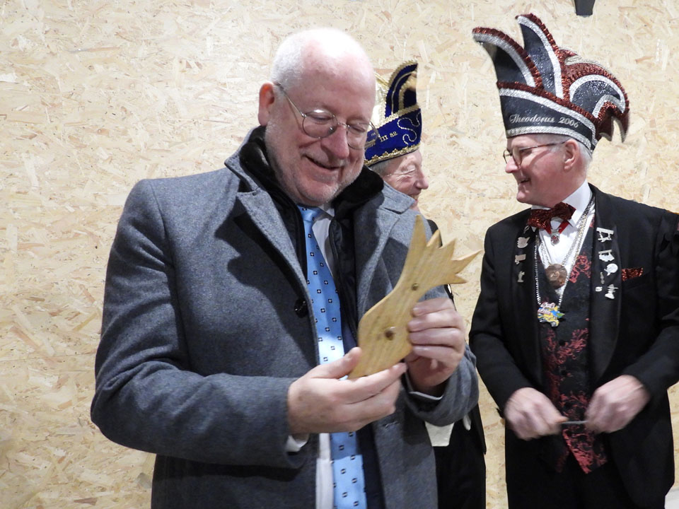 Oud Prins Theo Ikink heeft ter gelegenheid van dit 60-jarig jubileum een ‘Siepelkapstok’ ontworpen. Stadsprins Poef 1 en burgemeester John Joosten bevestigden deze ‘kapstok’ aan de gevel van het Heemhuis. Alle reden voor de burgervader om zijn waardering uit te spreken voor het Siepelhangen. “Ik denk dat ik in 2019 voor het eerst mee ben gegaan en heb het als iets heel bijzonders ervaren. Ik kan het mijn kinderen niet uitleggen, want je moet dit ‘gewoon’ meemaken. De gezelligheid, het samen door de donkeren en vaak kille nachten lopen en steeds weer dingen tegenkomen, die het zo bijzonder maken. De volgende dag heb je er wel wat spijt van, maar bij de overdracht van de sleutel op de Markt kom je ‘lotgenoten’ tegen. Dat zorgt dan wel weer voor een blijk van herkenning en een mooie boost om de carnavalszaterdag toch met veel energie te vieren. Voor mij is het meer dan duidelijk dat we de traditie van het Siepelhangen moeten doorgeven aan de volgende generaties en dat gaat ongetwijfeld lukken in de Siepelstad,” vertelt burgemeester John Joosten.