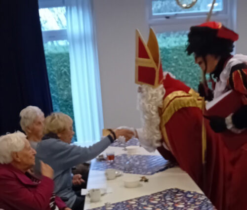 Spannender en boeiender was de reis van Sint en de Pieten vanuit Spanje door een heftige storm. Sint vertelde over hun belevenissen tijdens de Sintbingo. Dat gebeurde in verhaalvorm met de getallen erin verstopt. Dat was goed opletten om de juiste bingo te krijgen. Piet had ook mooie cadeaus meegebracht. Twee grote gezelschapspellen, dankzij de donatie van het Glazen Huis. Het werd een boeiende en gezellige middag en nadat Sint en Piet waren uitgezwaaid gingen alle gasten met een klein cadeautje en met een lach op het gezicht naar huis.