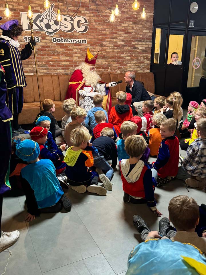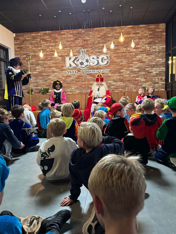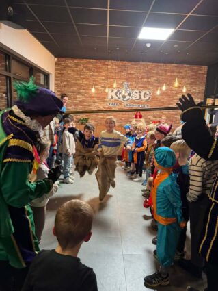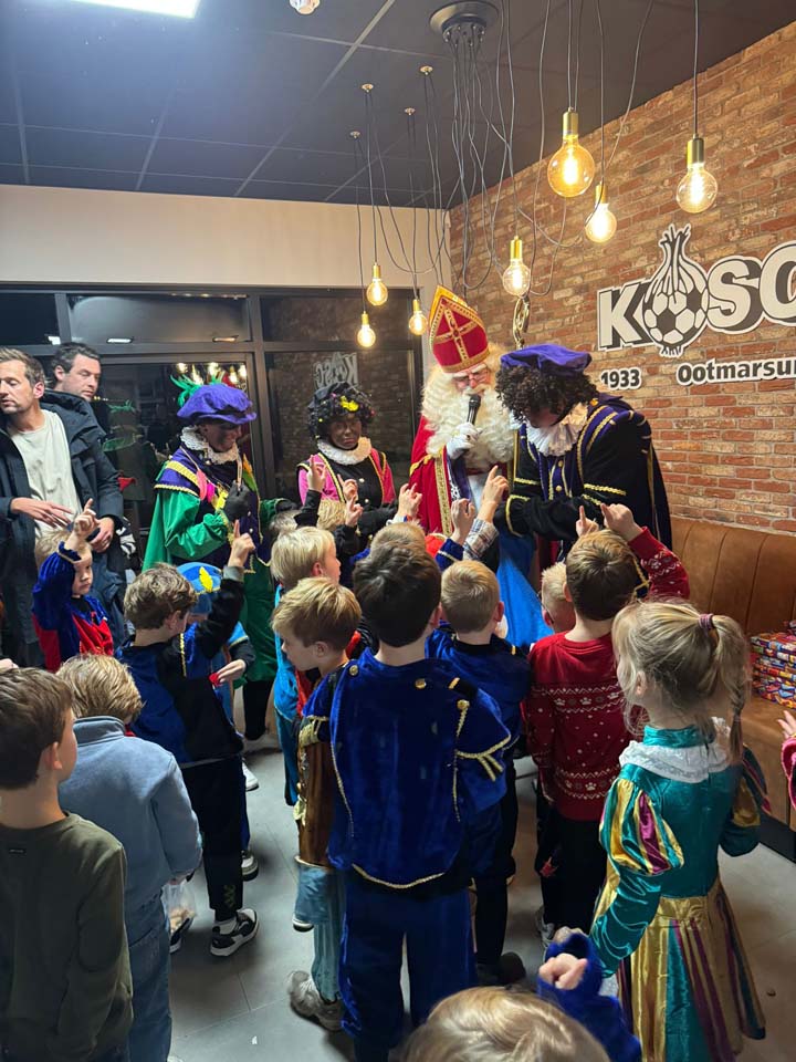 Bij een voetbalvereniging hoort Sinterklaas natuurlijk doelgericht naar het sportcomplex van KOSC. In de invallende duisternis en de vrieskou en schrijdend over twee voetbalvelden wist de Goedheiligman de ingang van de kantine te vinden. In de warme kantine werden ze verwelkomd door de mini-voetballers. Zij werden vol verwachting verrast met spelletjes en heerlijke pepernoten. Ook de leiders werden niet vergeten en een aantal belandde op de knieën van de Sint. Na het uitdelen van de cadeautjes en de laatste pepernoten klonk het luidkeels ‘Dag Sinterklaasje’ vond de Sint zijn weg weer naar zijn vertrouwde onderkomen.