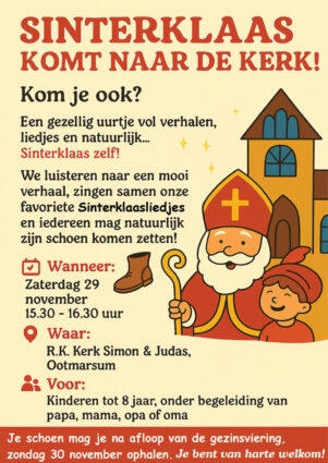Je schoen mag je na afloop van de gezinsviering, zondag 30 november 2025, ophalen. Je bent van harte welkom bij deze viering. Kom jij ook??