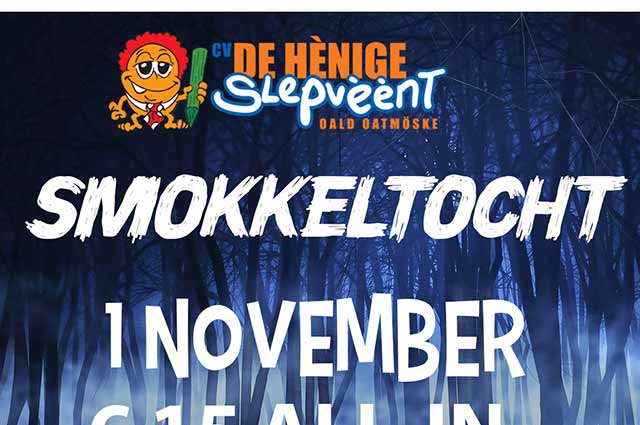 De Hènige Slepvèènt organiseren vrijdag 1 november weer de befaamde smokkeltocht. Deelname is voor iedereen. Dit jaar wordt begonnen bij de carnavalsloods van de Slepvèènt en van daaruit krijgen de deelnemers smokkelwaar mee, die ze veilig naar een volgende locatie moeten brengen. In het gebied waar ze lopen doorkruisen douanebeambten hun pad om de smokkelaars op heterdaad te betrappen. Op een ‘veilige’ locatie krijgen de deelnemers ook nog te maken met een ‘Mystery Guest’. Aan de hand van vragen moeten ze er achter zien te komen wie dat is. Daarna moet weer geprobeerd worden om ongezien de carnavalsloods weer te bereiken waar na afloop de prijzen worden uitgereikt en er een mooi eindfeest op poten wordt gezet.