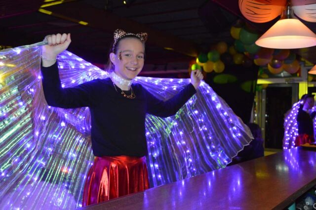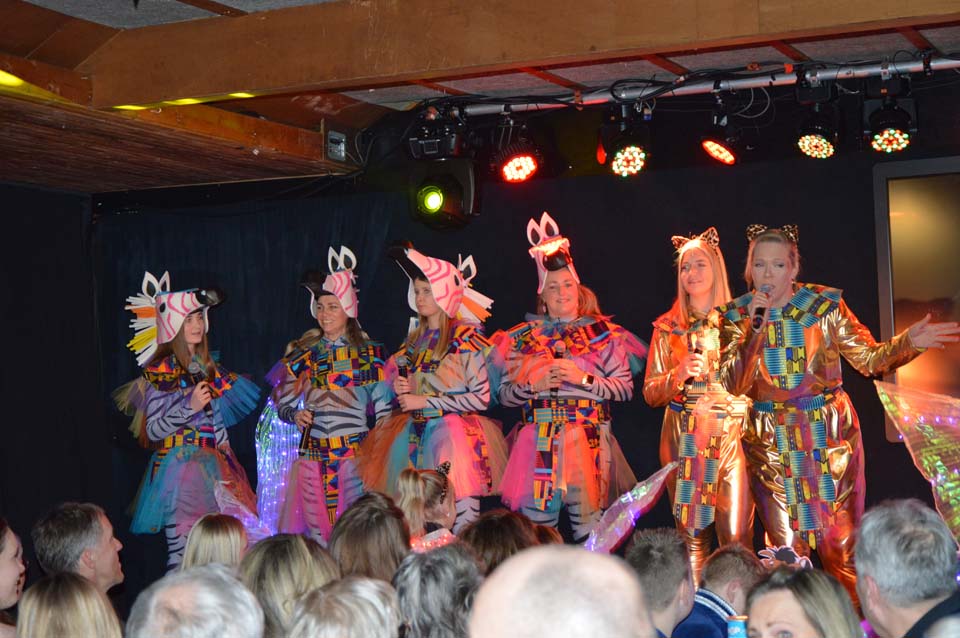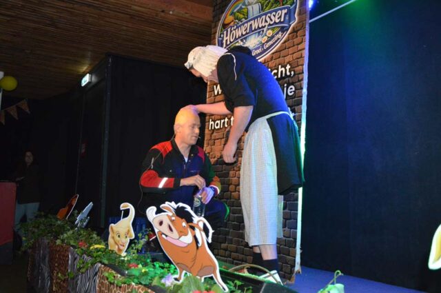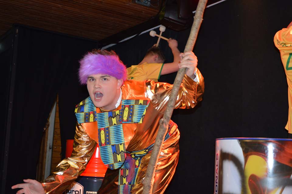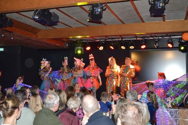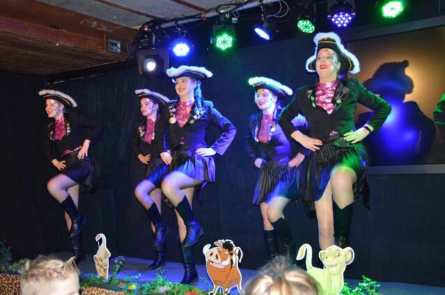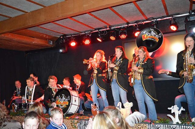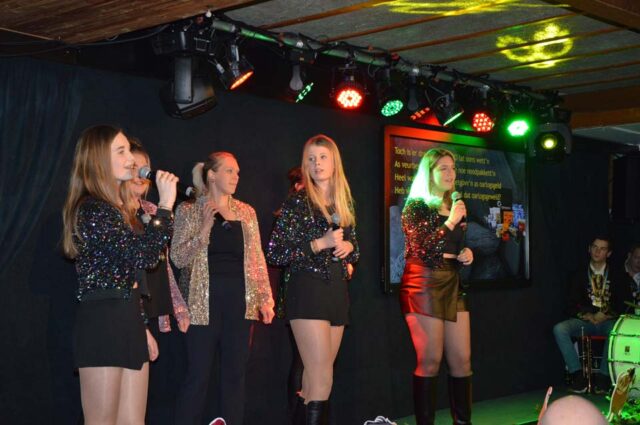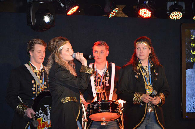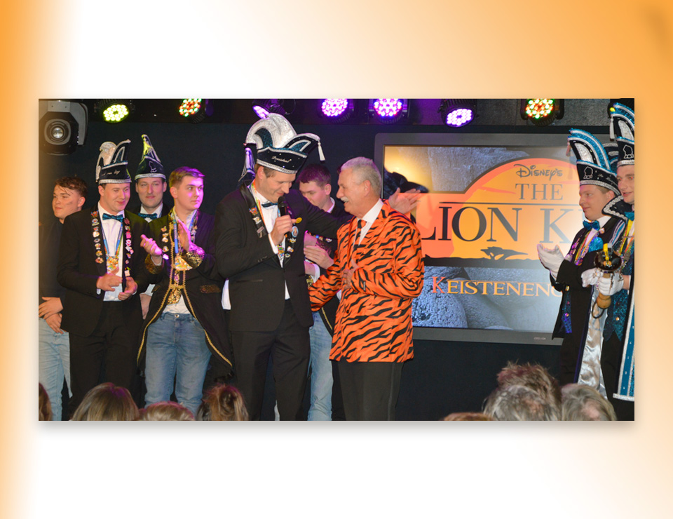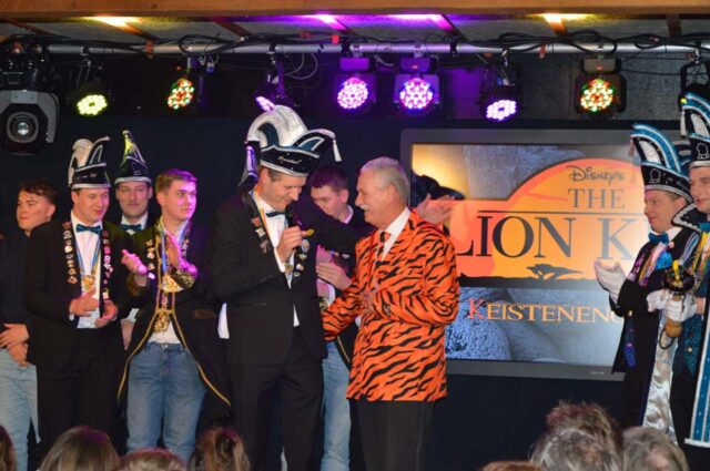 Dat geldt ook voor Gijs Aarnink en Wessel Vrerink. Al vele jaren verzorgen zij de ode aan de ridder. Het thema van de Keistenen ‘The Lion King’ was zichtbaar in de zaal, in de prachtige pakken, maar ook in de buut van Gijs en Wessel. Zij maakten van Tim uiteraard Timba en van Koen Koenba. Naderhand wisten we heel veel van dit duo dat de Keistenen door het carnaval 2026 heen loodst. “Wij gaan stunten, tien bier en negen munten” werd heel duidelijk uitgelegd en dat Koen het ‘directeurtje’ bij SCS is, kwam ook mooi naar voren. Een prima ode, die zorgde voor een mooie start van de diverse buuts. De Keisteenzangeressen vervolgden de ode met een mooie tekst, een swingende melodie en gevoed door passende beelden over deze beide hoogheden.