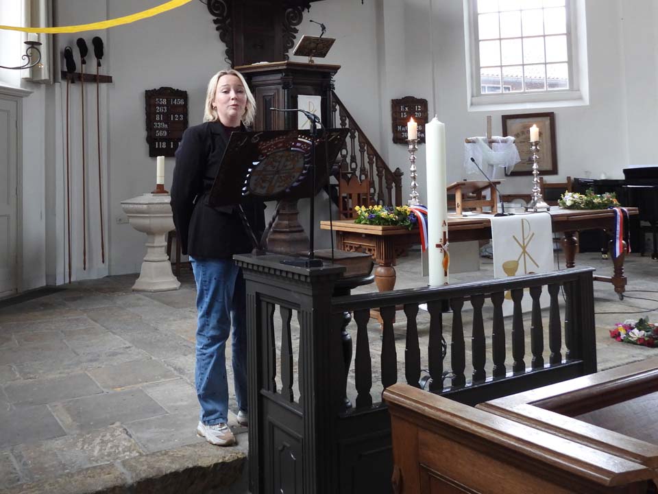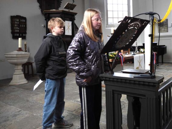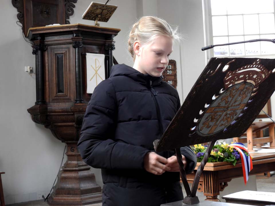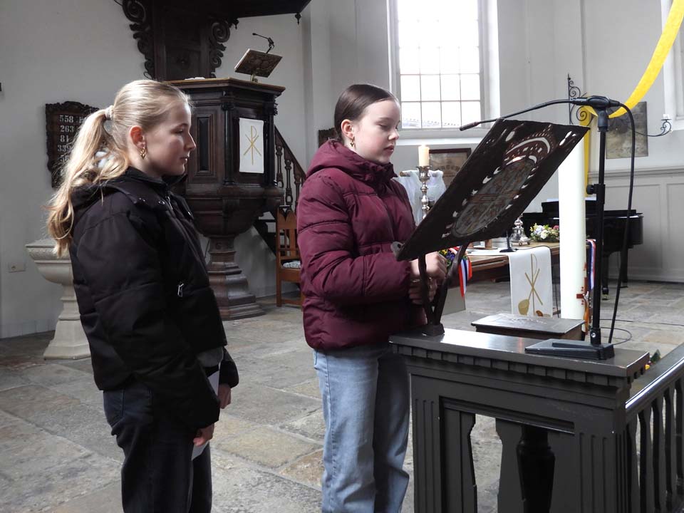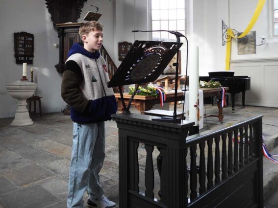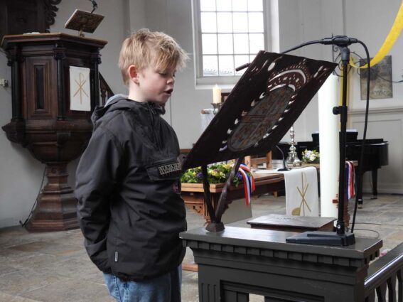Dit jaar valt 4 april op zaterdag dus kwamen op de derde april de leerlingen van de groepen 8 naar de Protestantse kerk. Leerkracht Dionne Lukens opende deze bijeenkomst en legde een verband met de huidige oorlogen, die in 2026 woeden. Ook vertelde ze dat de verhalen uit WO2 de leerlingen erg aanspraken en dat ze daar op verschillende manieren mee aan de slag zijn gegaan. De leerlingen hebben bezoek gehad van Johan Albeda. Hij vertelde over zijn vader, die volop in het verzet heeft gewerkt. Al die belevenissen maakten op de kinderen veel indruk.