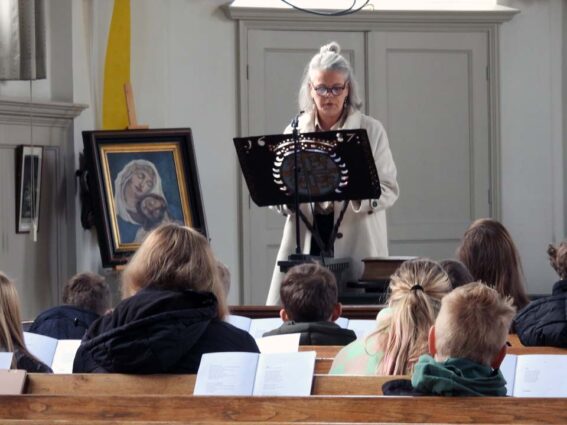 Adjunct directeur Francy Wilthuis deelde met de kinderen in de kerk de verhalen, die ze van haar vader hoorde. “Ik kan me heel goed voorstellen dat (jonge) mensen angstig worden van alles wat er nu in deze wereld gebeurt. Ik denk regelmatig aan mijn vader. Hij was twee jaar toen de oorlog begon. Mijn opa had een boerderij en op een bepaald moment werd de deel in beslag genomen door de Duitsers. Daar kwamen Duitse soldaten. Mijn vader vertelde dat die soldaten best aardig waren. Het waren nog jonge mensen, die liever niet vochten, maar een toekomst wilden opbouwen. Het was oorlog, dus ze moesten vechten. Er lag altijd een stapeltje kleren klaar. Als het gevaarlijk werd deden ze daar een riem om en namen ze het mee naar de kelder, totdat het weer veilig was. Wat spannend allemaal. Nu denk ik wel eens: ‘Hoe kunnen we vrede verspreiden’. Mijn vader heeft me altijd voorgehouden dat vrede en vrijheid niet vanzelfsprekend zijn. Belangrijk vond hij het om in ieder mens een medemens te zien. Die boodschap heeft hij mij meegegeven en hoe mooi is het dat je dat kunt waarmaken,” vertelt juf Francy. Tussen de verhalen door zongen de kinderen passende liederen.