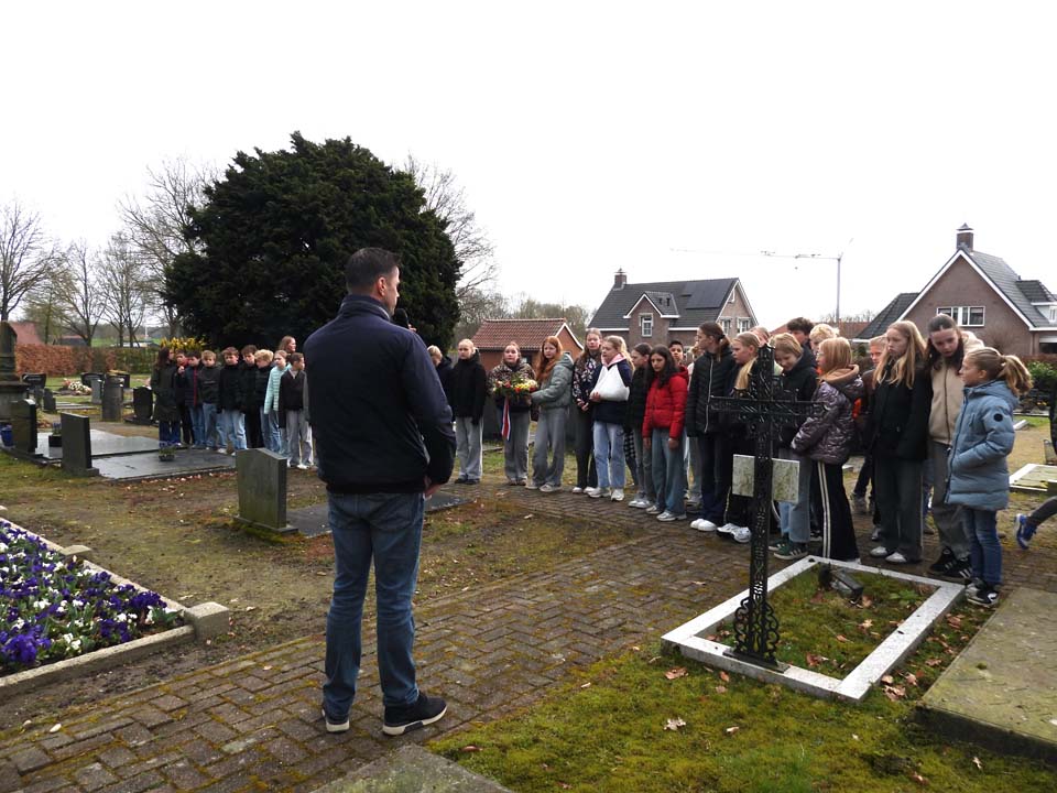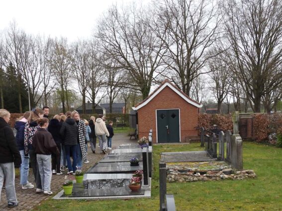 De kinderen van de Meander liepen naar de Hervormde Begraafplaats. Leerkracht Robert Westerhof vertelde over het bombardement op het Bergplein eind januari 1945 waarbij twee inwoners van Ootmarsum om zijn gekomen. Dat zijn Johan Heupink en Femmetje (roepnaam Femmie) Davids. Johan Heupink is op het r.-k. kerkhof begraven. Femmie op de Hervormde Begraafplaats, want zij gaf destijds ook les aan de Hervormde school in Ootmarsum. Het is een eenvoudig graf en niet te vergelijken bijvoorbeeld met het grafmonument van de vier piloten, die ook op deze begraafplaats liggen. In overleg met de familie en de (protestantse) gemeente is er een nieuw initiatief om ook Femmie Davids een passend monument te geven waar dan ook een naamplaatje voor Johan Heupink zal komen. De gesprekken zijn gaande en ideeën worden in de komende weken met alle betrokkenen concreet gemaakt.