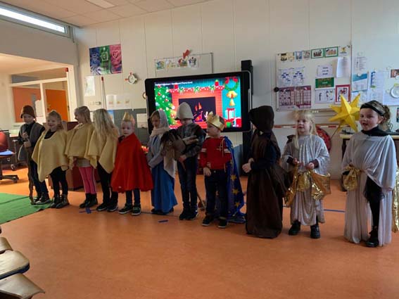 Bijna alle boodschappen voor een broodmaaltijd waren al ingeslagen. Gymjuf Patricia en busmaatschappij Brookhuis werden afgebeld en op dinsdagmiddag was er, in plaats van de gymles, een heerlijke kerstlunch met aansluitend de kerstviering. Voor de viering had elke groep iets voorbereid. De leerlingen van groep 4 droegen het gedicht ‘De vier kaarsen’ voor en daarna waren de leerlingen van groep 1,2 en 3 aan de beurt om het kerstverhaal uit te beelden. Een gedicht over de drukke postbodes werd voorgelezen door twee leerlingen van groep 5, waarna de hele groep het lied ‘Vrolijk kerstfeest’ zong met de beste wensen voor iedereen. De bovenbouwleerlingen dansten op ‘Niks is cooler dan kerstmis’ van Kinderen voor kinderen. Toch nog een mooie afsluiting waar voldaan op terug gekeken kan worden!