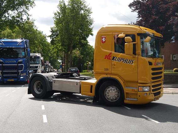 Zo’n 400 vrachtwagens nemen deel en die zijn verdeeld in 10 colonnes. Onderweg zorgen verkeersregelaars en agenten dat de veiligheid gewaarborgd blijft. De kruisingen worden afgezet, zodat de colonnes hun weg kunnen vervolgen. ‘Onze Ootmarsummer Erwin Kremer reed ook mee in een vrachtwagen van Kuiphuis. Ook Ootmarsumse transportbedrijven waren er bij en zijn werden natuurlijk in hun stadje extra feestelijk onthaald door de Siepels langs de kant. Een prachtig evenement en met name voor de cliënten van de Twentse Zorgcentra. Het is inmiddels de 28e keer dat het is georganiseerd, maar aan deze reeks mag eigenlijk geen einde komen. Het is zo mooi voor alle betrokkenen!!!!